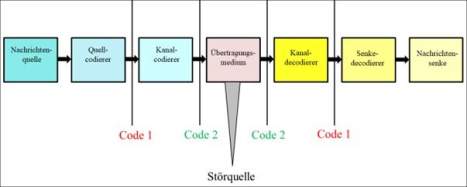 Die Abbildung zeigt den Weg, den eine Nachricht von ihrem Erzeuger (Nachrichtenquelle) bis hin zum Empfänger (Nachrichtensenke) nimmt. Die Kanalcodierung hat die Aufgabe, die Nachricht für das jeweilige Übertragungsmedium passend zu machen. Schließlich wird die Nachricht in der Nachrichtensenke "genutzt", das heißt, sie wird interpretiert, weiterverarbeitet, gespeichert, verfolgt, usw.
